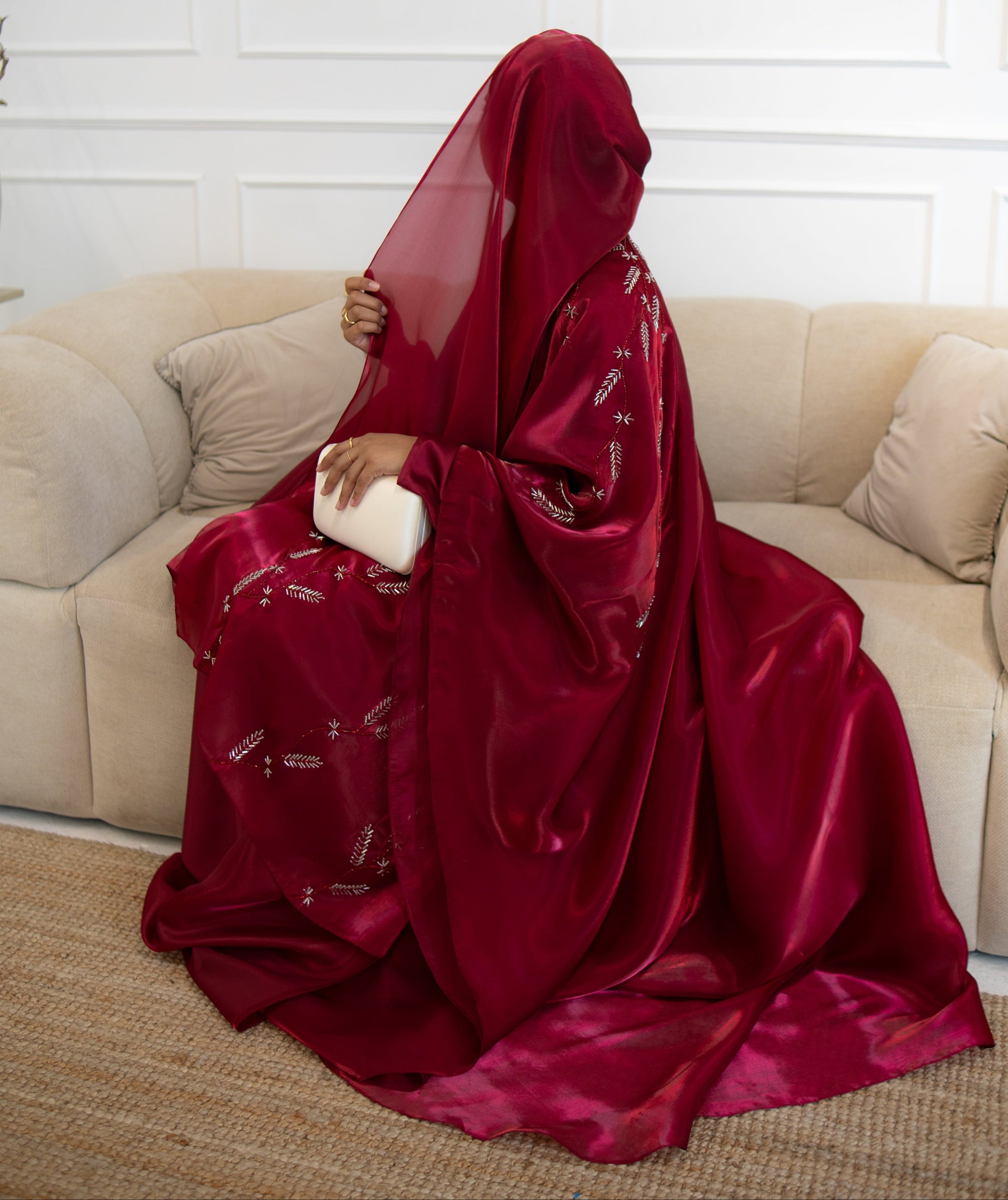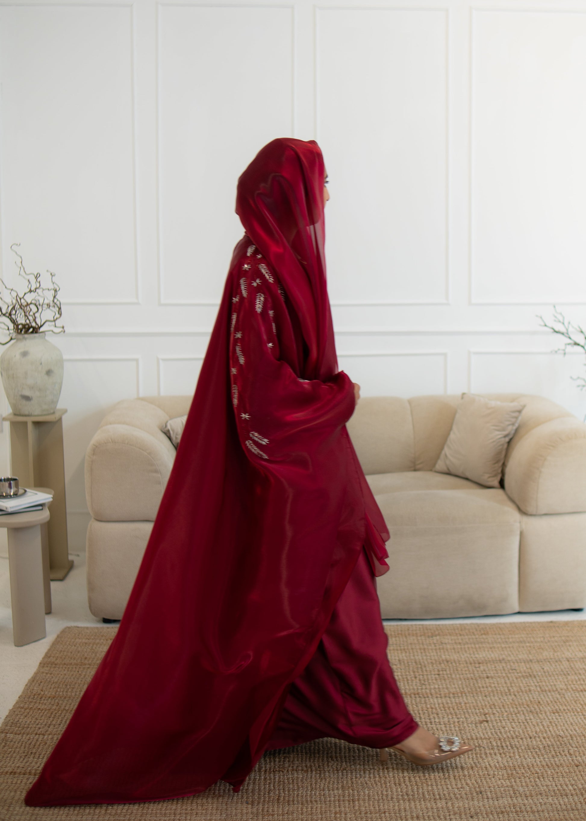 This red 3-piece abaya set is crafted for effortless and modest luxury.